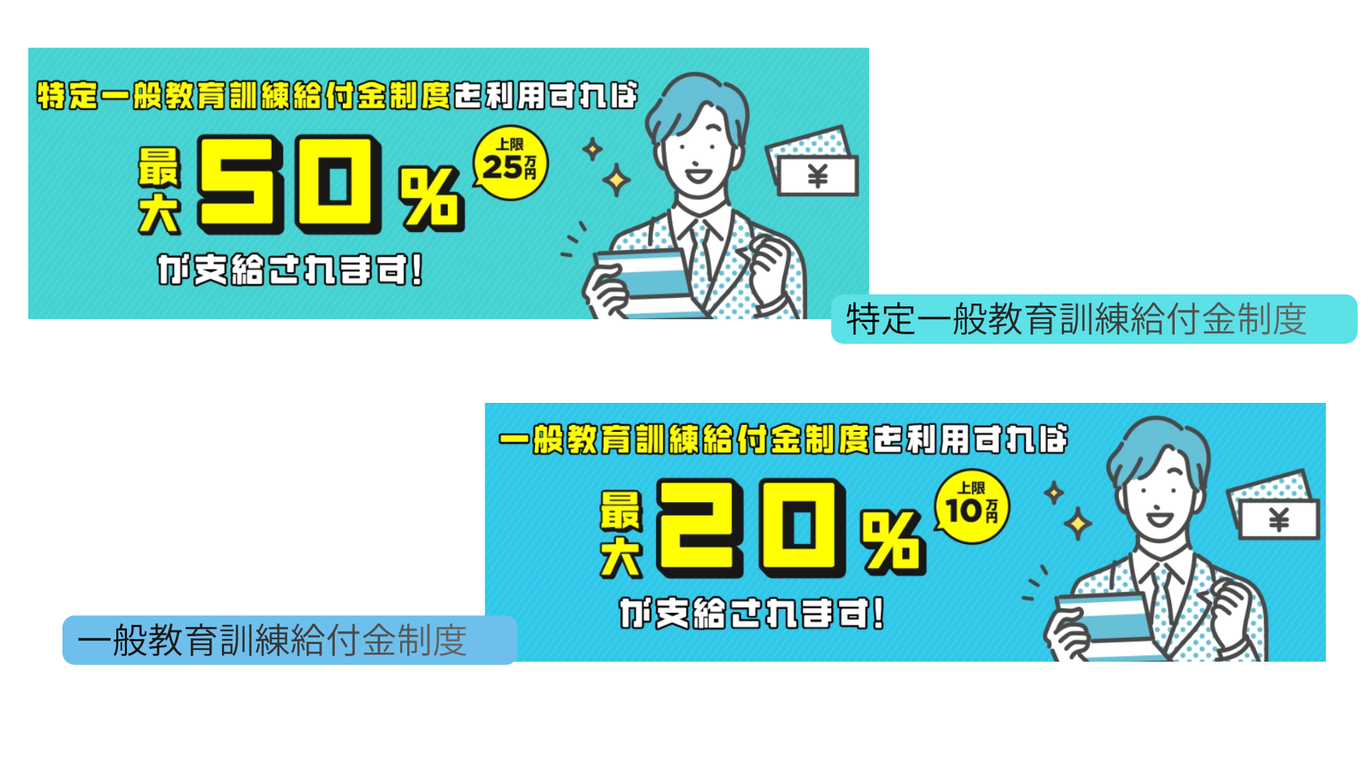 20%給付の一般教育訓練と50%給付の特定一般教育訓練があります。希望する免許のプランによって利用できる給付金が異なるため、詳しくは各ページでご確認ください。