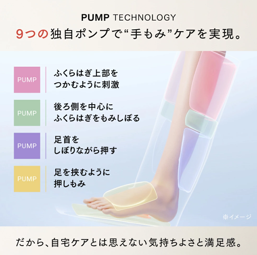 9つのポンプが連動して、ふくらはぎからつま先まで一気にほぐしてくれます。