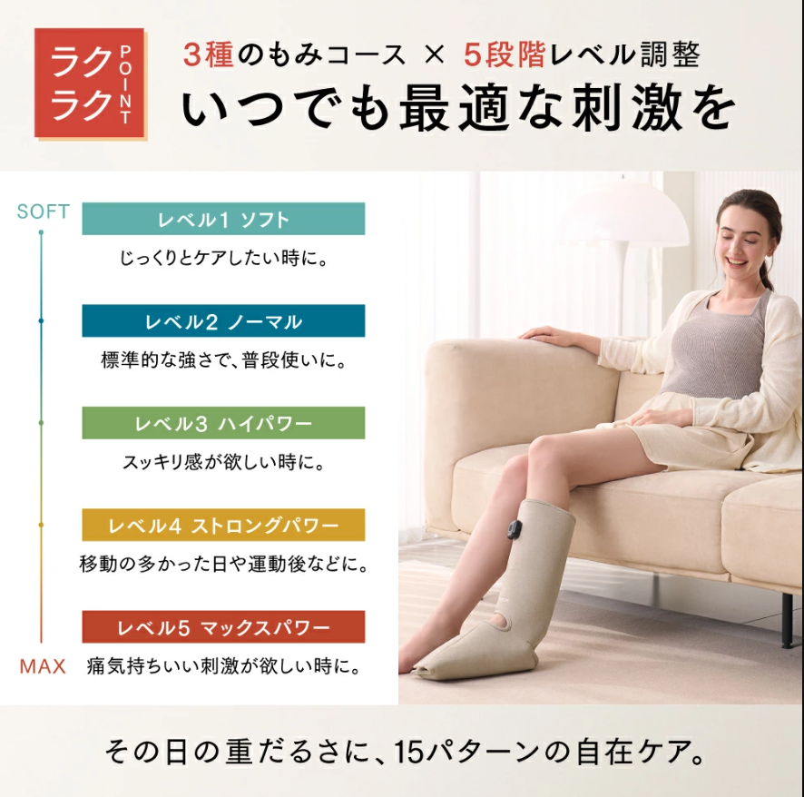 ふくらはぎから足首、つま先まで包み込む強力なエアポンプで、血流を促してだるさがスッキリするという意見が多い。