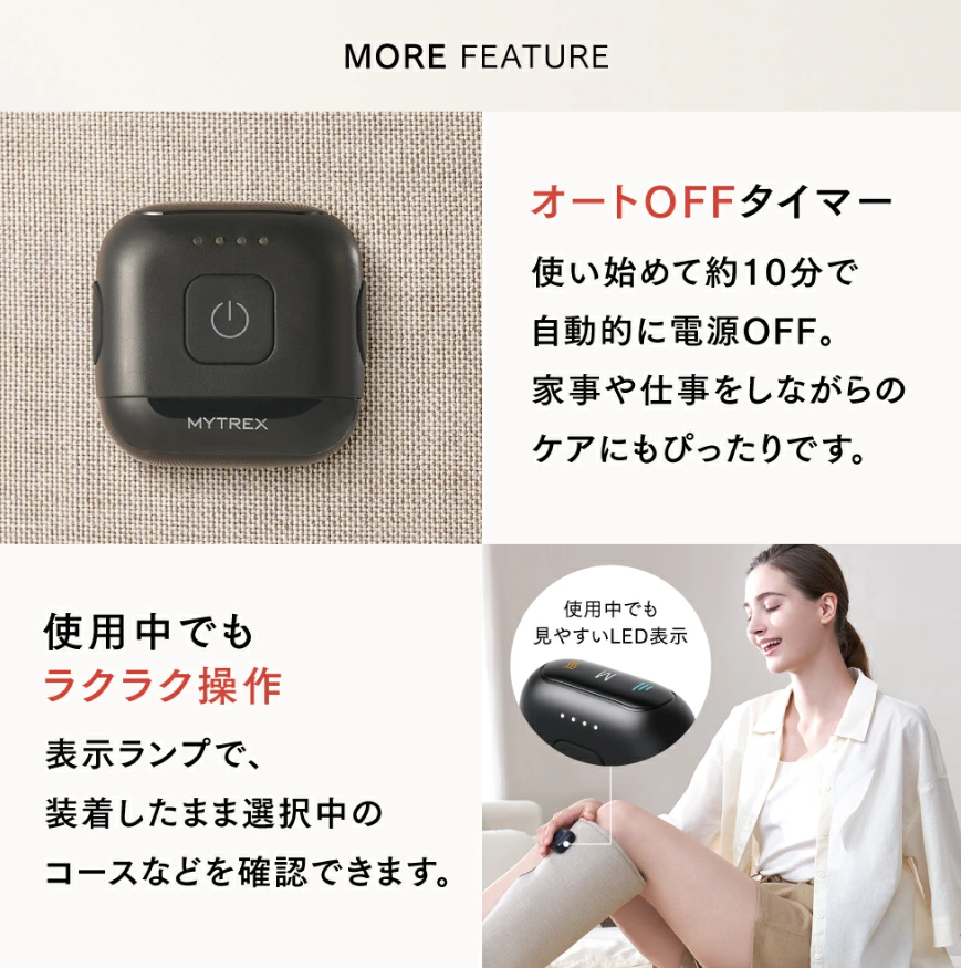 使った後に「脚が軽くなった」「翌日の疲れが残りにくい」といった声が多い。特に立ち仕事や長時間の移動後、運動後のケアとして有効という意見が目立つ。さらに自動オフ(10分タイマー)があるので、ケア時間を管理しやすいとの声もある。