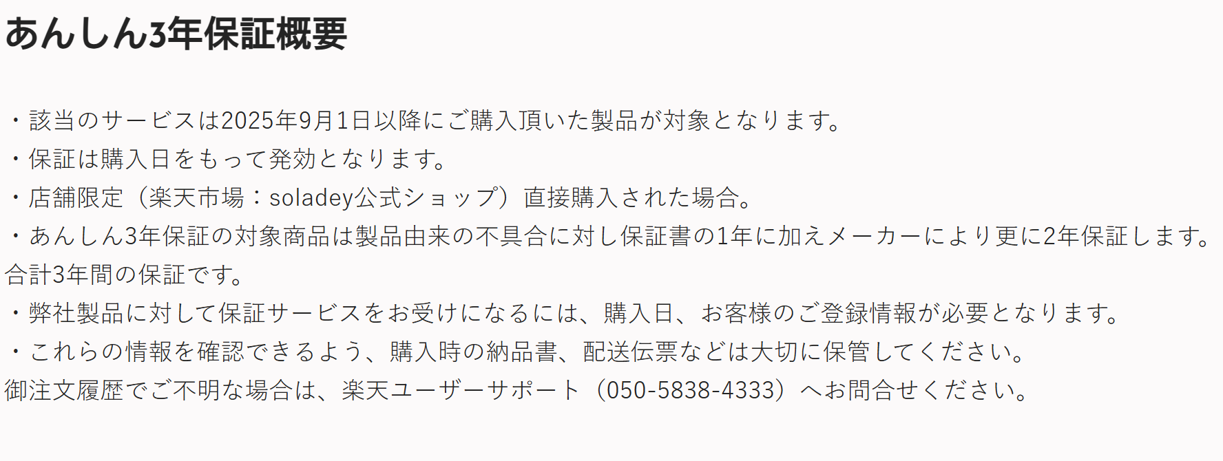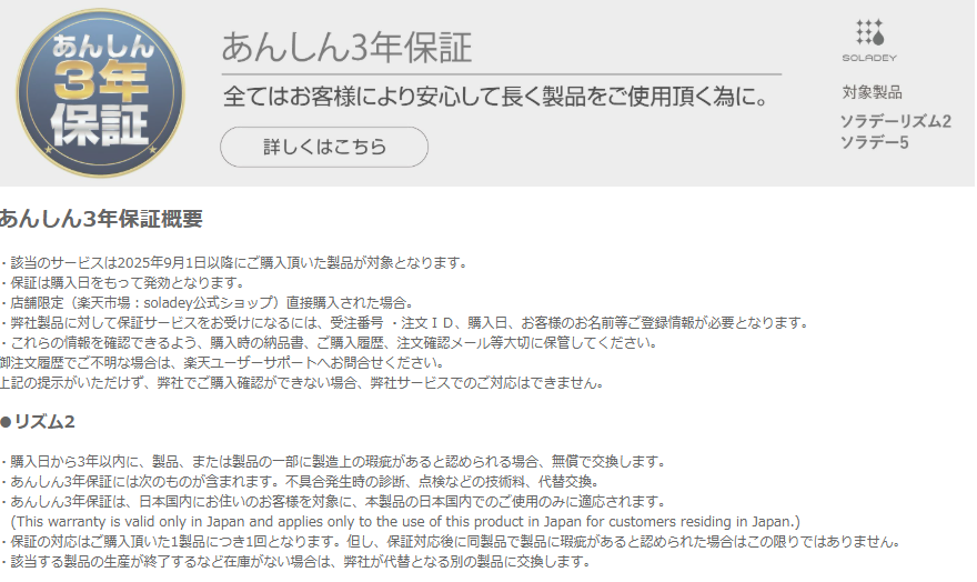 ソラデーリズム2のキャンペーンを探すことが出来ませんでしたが、3年保証というのが公式HPと楽天市場で見られたので、こちらはいつまでの期間やるのか?はわからないので、確実である今がチャンスだと言えます。