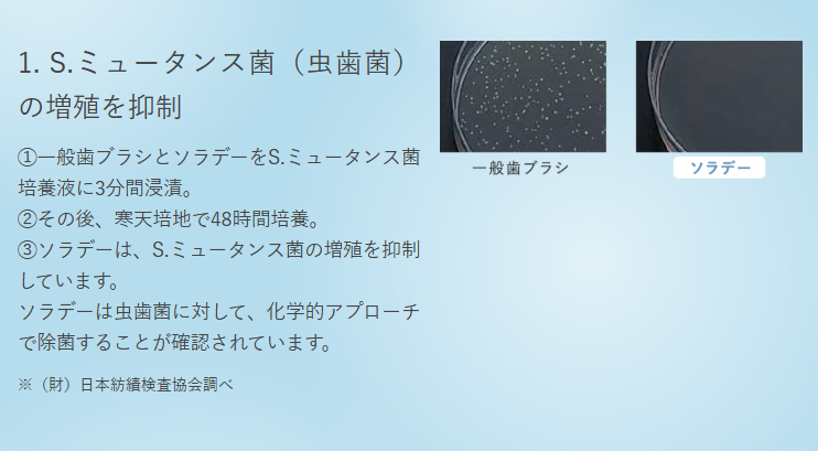 ソラデーは虫歯菌に対して、化学的アプローチで除菌することが確認されています。※(財)日本紡績検査協会調べ