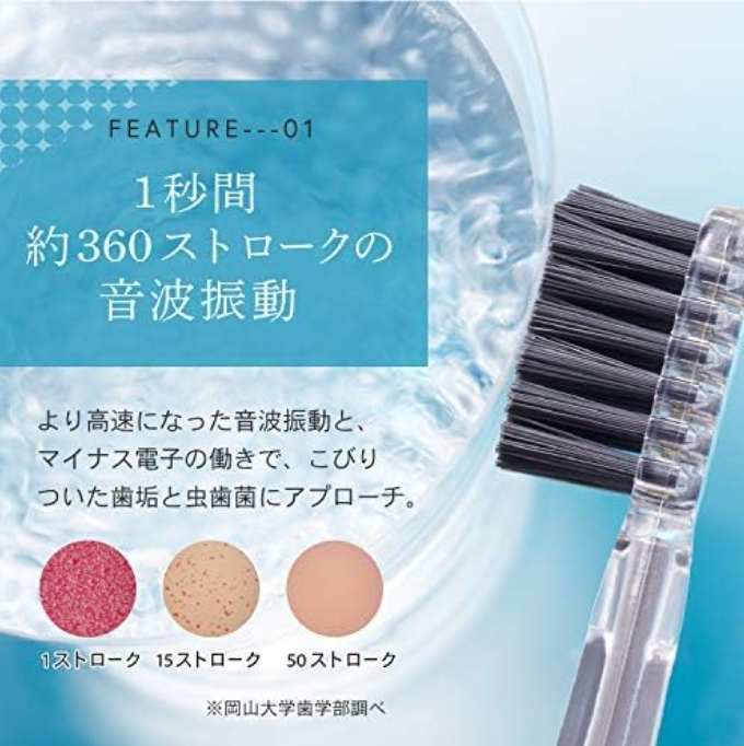 - この振動が歯の表面のプラーク(歯垢)を剥がしたり、歯ブラシ毛先が届きにくい所に“水流”を生んで洗浄を助けたりする役割を持つ。