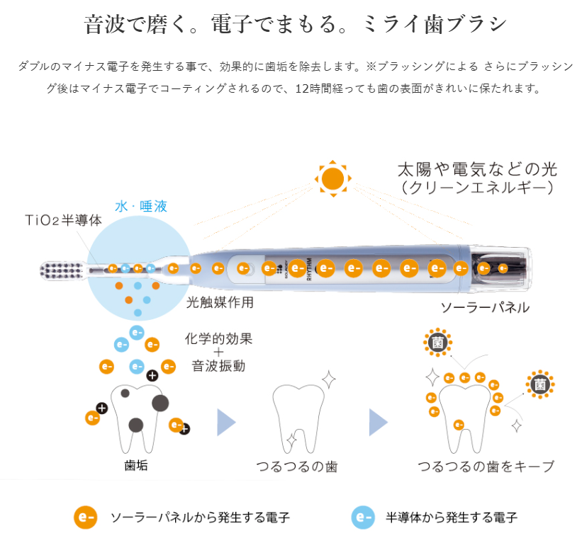 化学作用(電子発生) | 本体に 「TiO₂(酸化チタン)半導体」+「ソーラーパネル」を内蔵。光と水の反応でマイナス電子を生み、歯に作用するとされてる。 |