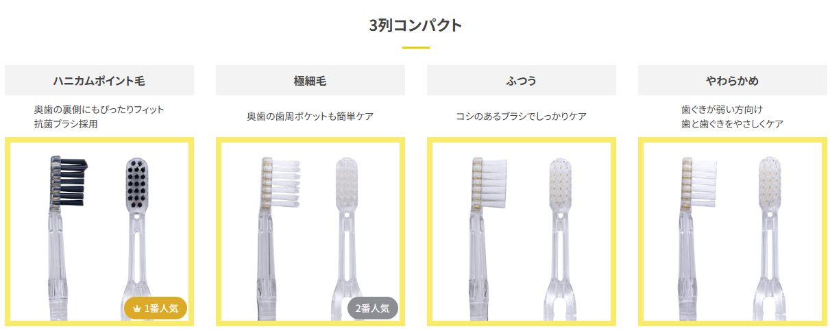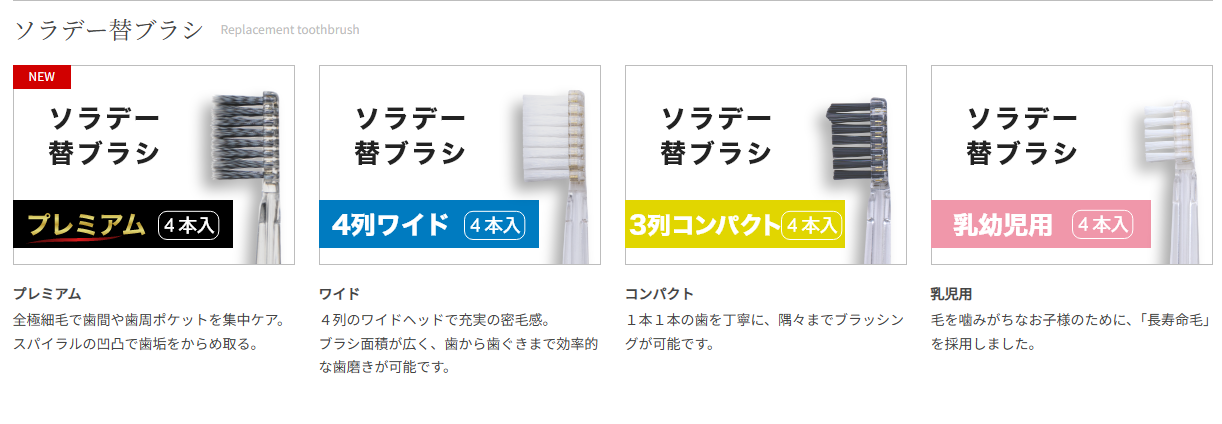 ソラデーリズム2の替えブラシは“4列ワイド”“3列コンパクト”“乳幼児用”など、口の形や好みに合ったものが選べる。